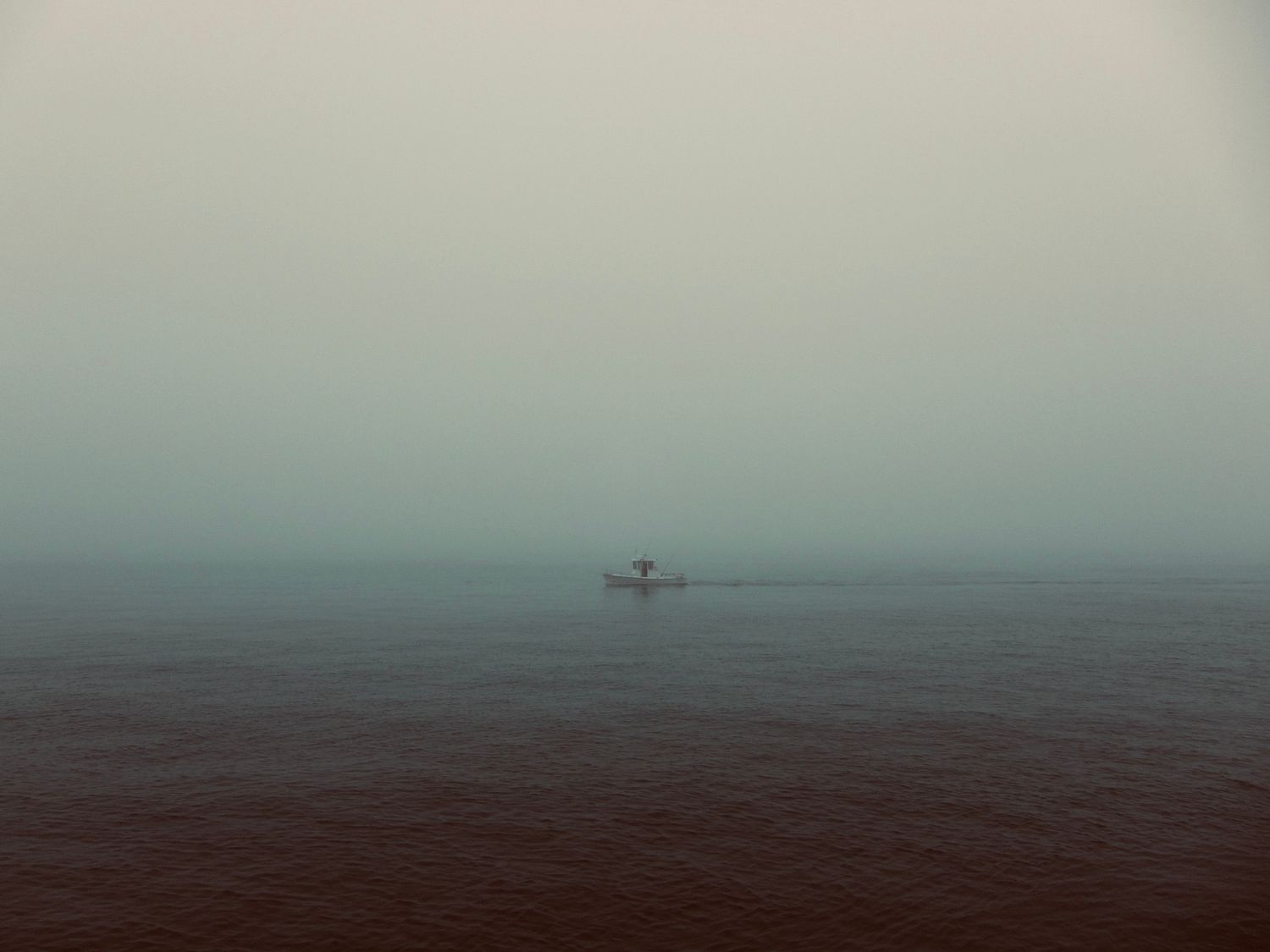 PHOTOGRAPH I CREATED OF A BOAT IN THE FOG HEADING NORTH OFF THE COAST OF SOUTH PORTLAND, MAINE, USA