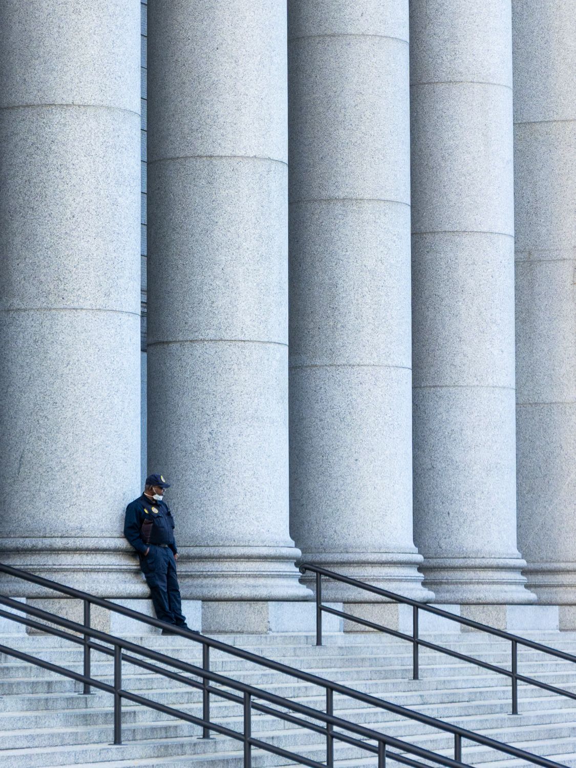 A guard resting at the top of the stairs of the Thurgood Marshall U.S. Courthouse in New York. This was taken at the tail end of the COVID pandemic, so wearing a mask was still a common sight.