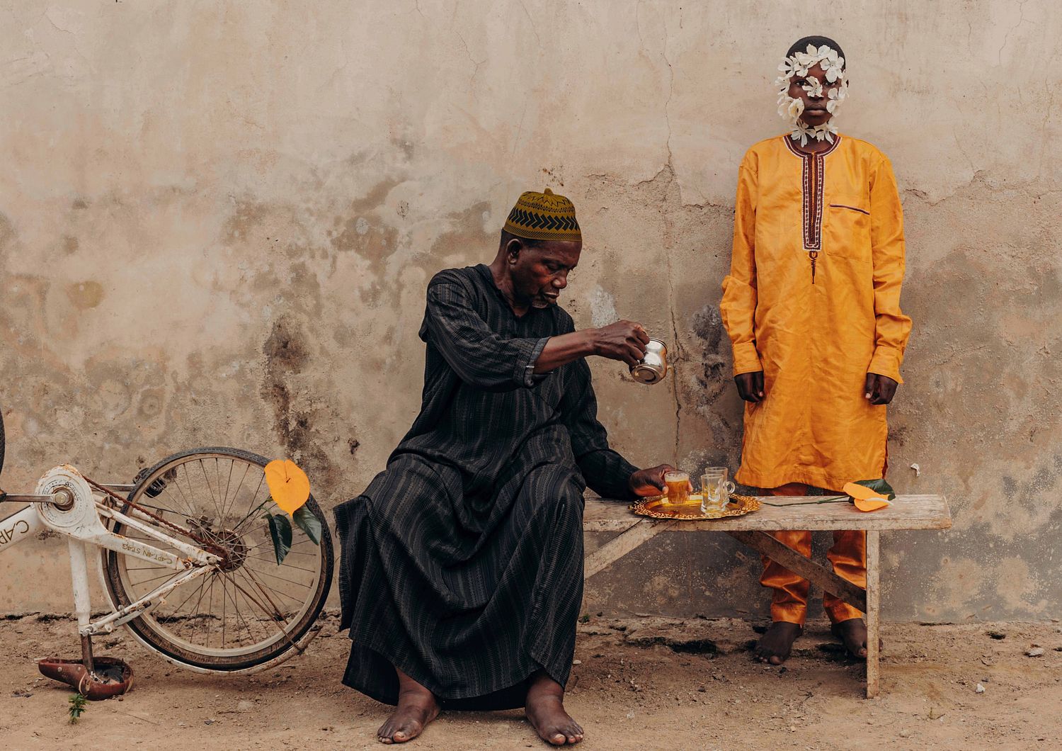 From my series Brewed Reflections: The Poetry of Ataya, a project that explores memory, identity, and community through the 'Ataya' tea ritual from West Africa. This image reflects on the balance between past and future. My uncle (pictured seated), who taught me the Ataya tea ritual, represents the wisdom passed through generations. The flower- masked figure stands for the youth: growing, changing, yet rooted. It shows how small traditions like tea-making keep us connected across time.