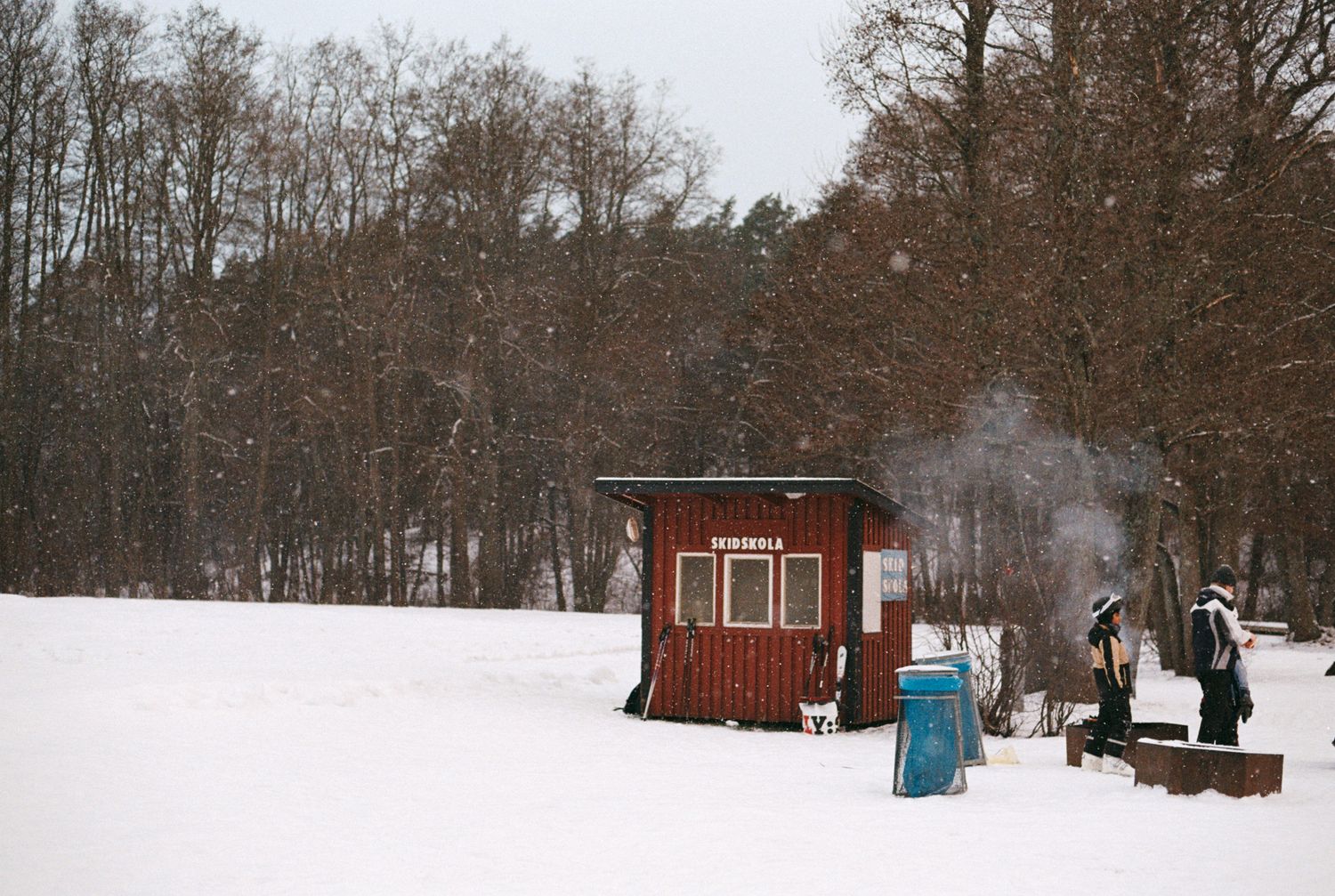 An analog shot of kids warming up near a campfire at Flottsbro Ski Resort, Stockholm, January, 2026