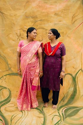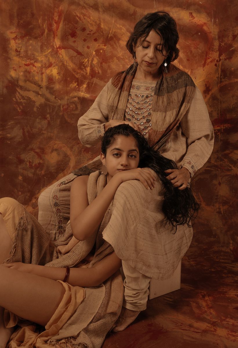 "interthread" is a collection of documentary portraiture that reimagines the photographic backdrop as a nomadic sanctuary and site of collective care: a physical safe space that exists free from the burdens of the exterior world. Traveling from photo studios in New York City to rooftops in New Delhi, the hand-painted canvases connect sitters across generations and national origins. Centering women and their bonds, the work explores belonging, solidarity, and love in its many forms. From a self-portrait of my mother oiling my hair, to identical twins navigating queerness together within the fashion industry, to my grandmother holding a photograph of herself and her sisters as teenagers as the only surviving sister, the photographs dwell in moments of shared intimacy, reconciling with what is lost in migration while honoring the interconnectedness of shared experience.