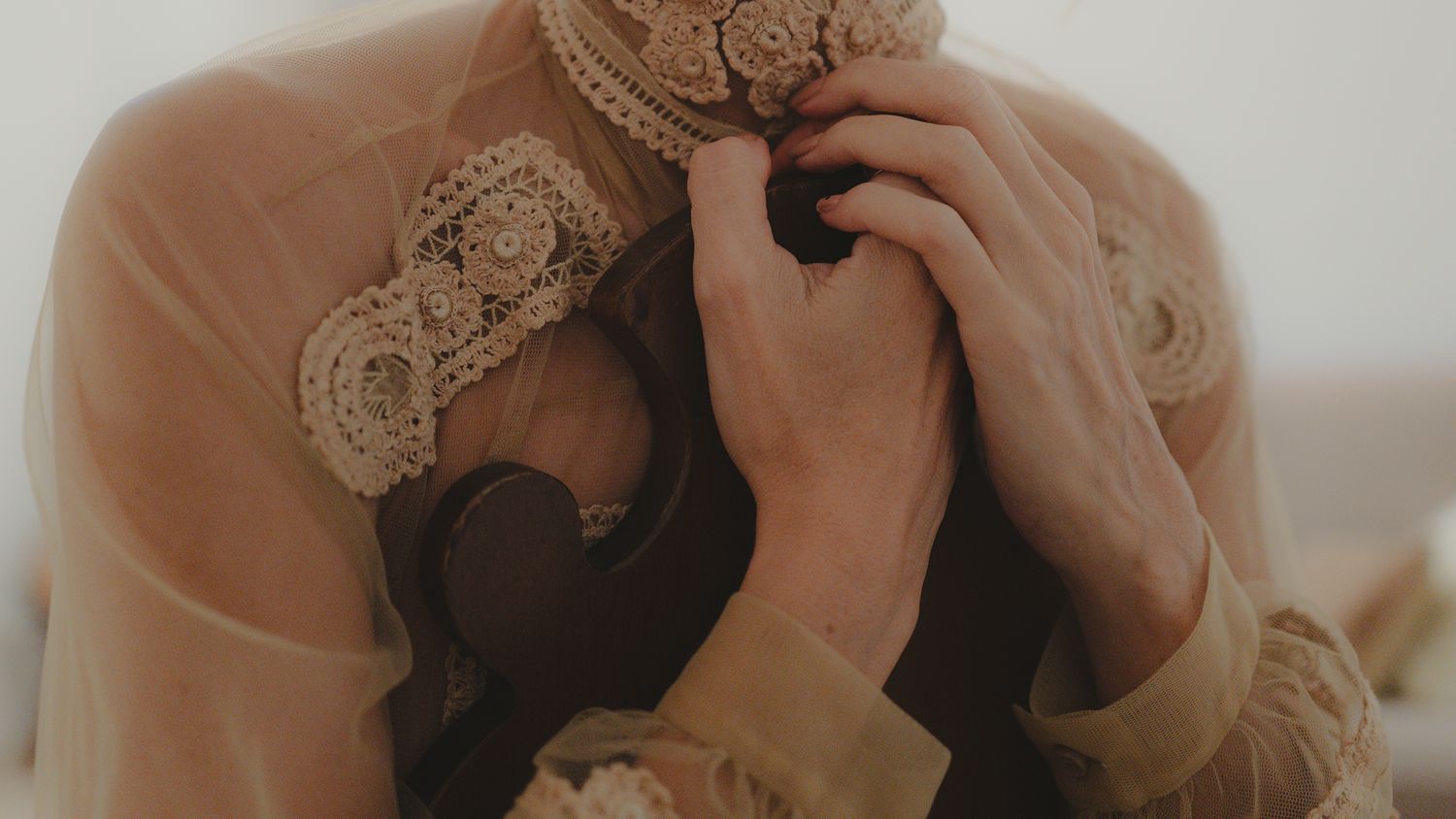 "La sainteté, l'érotisme et la solitude" La sainteté the clasped hands recall the ancient gesture of prayer, a silent upward tension. L'érotisme the skin that appears beneath the flesh-colored veil, an undeclared, unseen desire, but felt from within, like an echo. La solitude an embrace directed at herself, clasping to her chest an object devoid of soul and warmth, which becomes presence only in the need for contact.