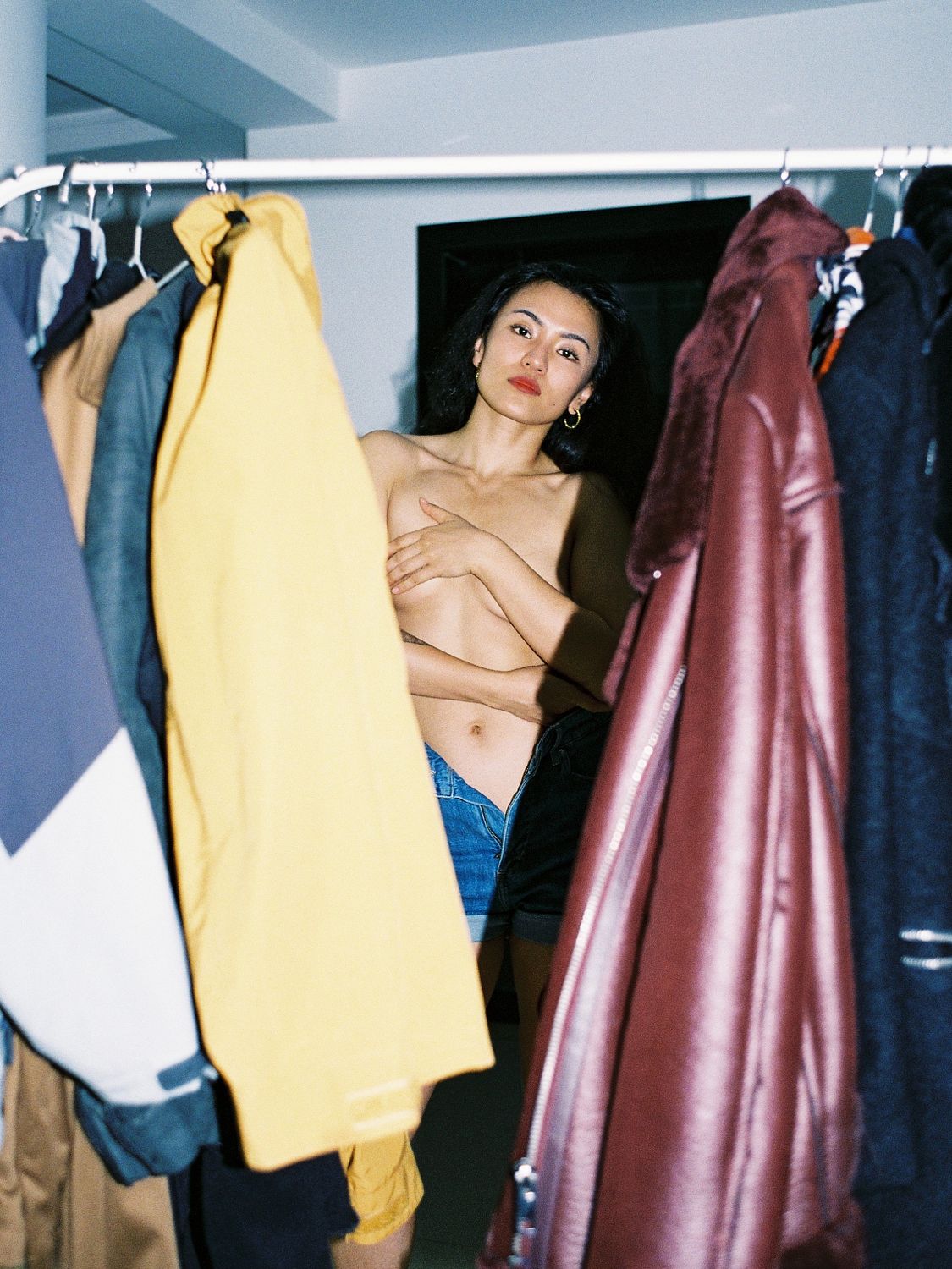 Between Garments A figure appears quietly between rows of hanging clothes, framed by jackets and coats in the dim interior of a room. Illuminated by the stark light of a direct flash, the moment feels both casual and slightly theatrical — as if the subject has just stepped out from the private space behind the garments. The photograph lingers on this in-between moment, where everyday life and performance briefly overlap.