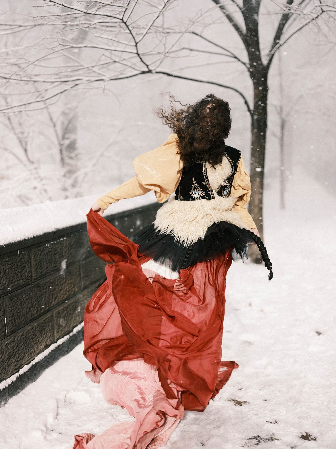 On fire, with Storrveldi. While working with the design house Storrveldi in NYC, Riley (model) and I were able to catch the most enchanting snow storm in Central Park.